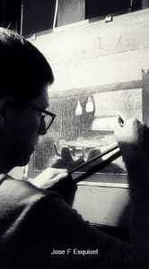José Fabio Esquivel (b. 1974) is a contemporary charcoal artist whose work explores liminal territories and psychological landscapes through dramatic chiaroscuro technique. Working exclusively in charcoal on paper, Esquivel creates highly detailed compositions that examine the emotional states of individuals existing at society’s margins. His practice transforms spaces of potential isolation—urban thresholds, forest clearings, and architectural boundaries—into what he terms “transitional refuges.”